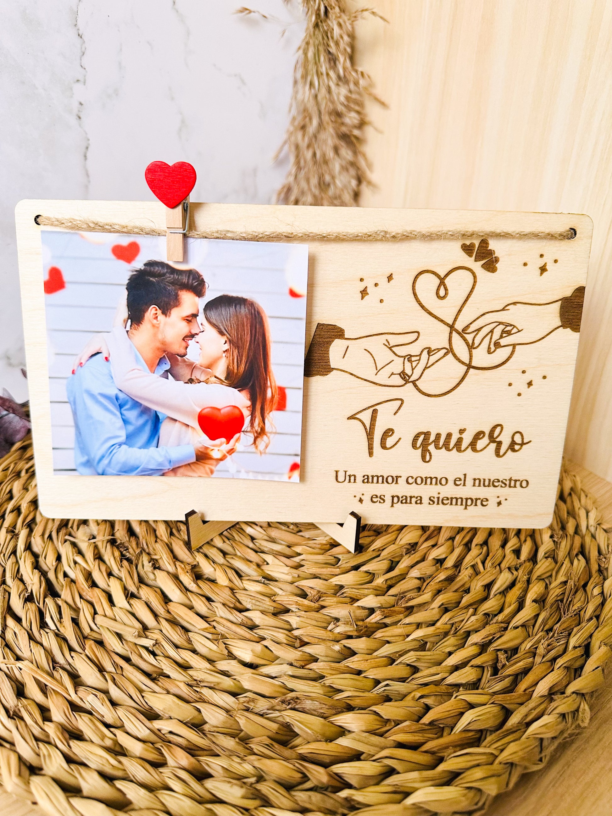 Con diseño romántico y la frase “Un amor como el nuestro es para siempre”.