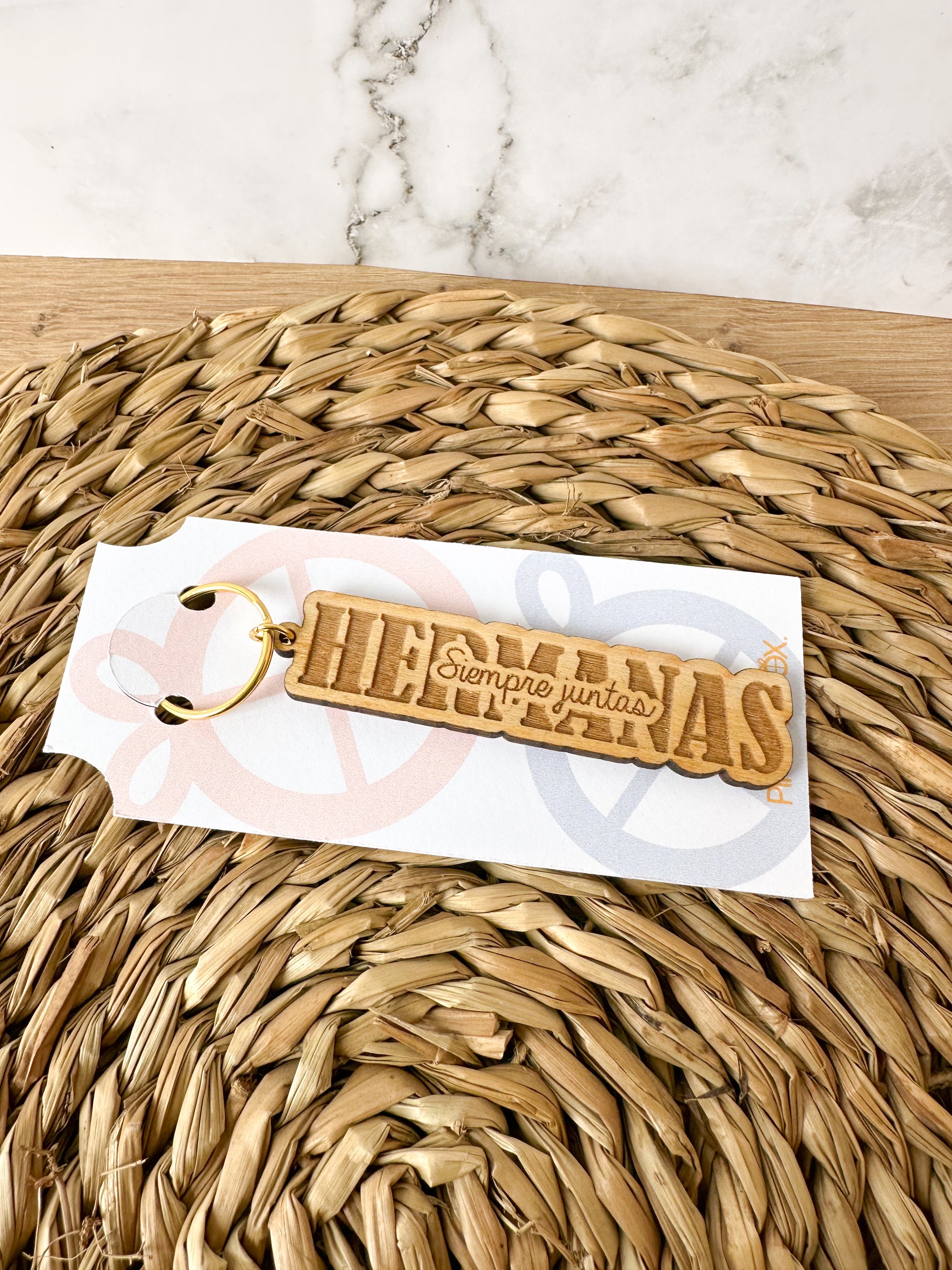 Llavero grabado en madera con la palabra HERMANAS y una frase corta personalizada, como: