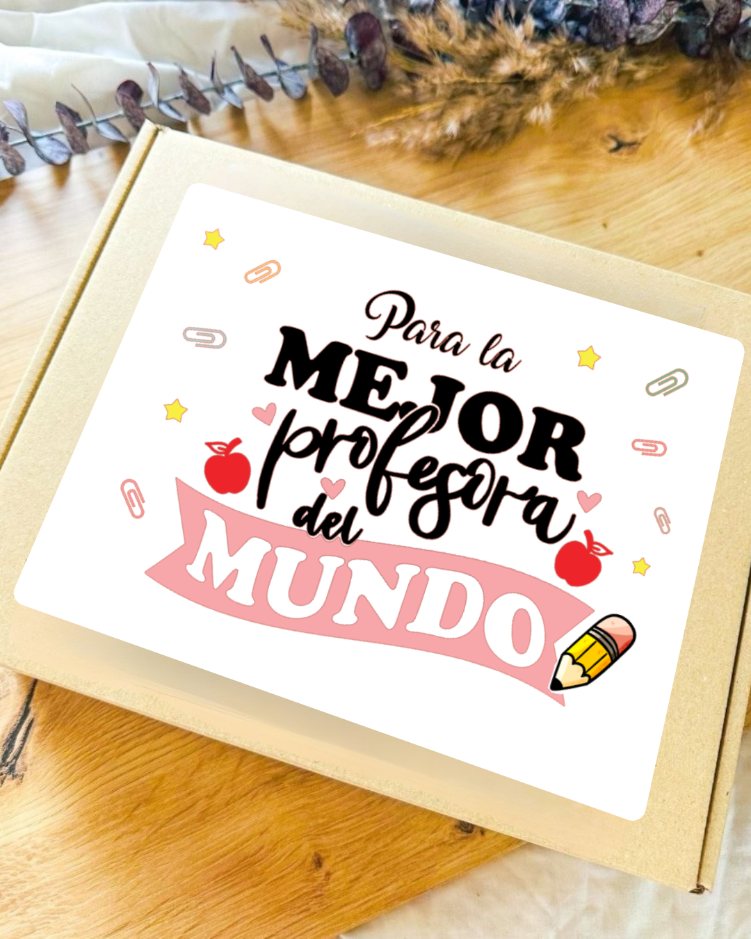 La Box viene decorada con una pegatina especial “Para la mejor profesora del mundo”, preparada para entregar y hacerla sonreír al instante.