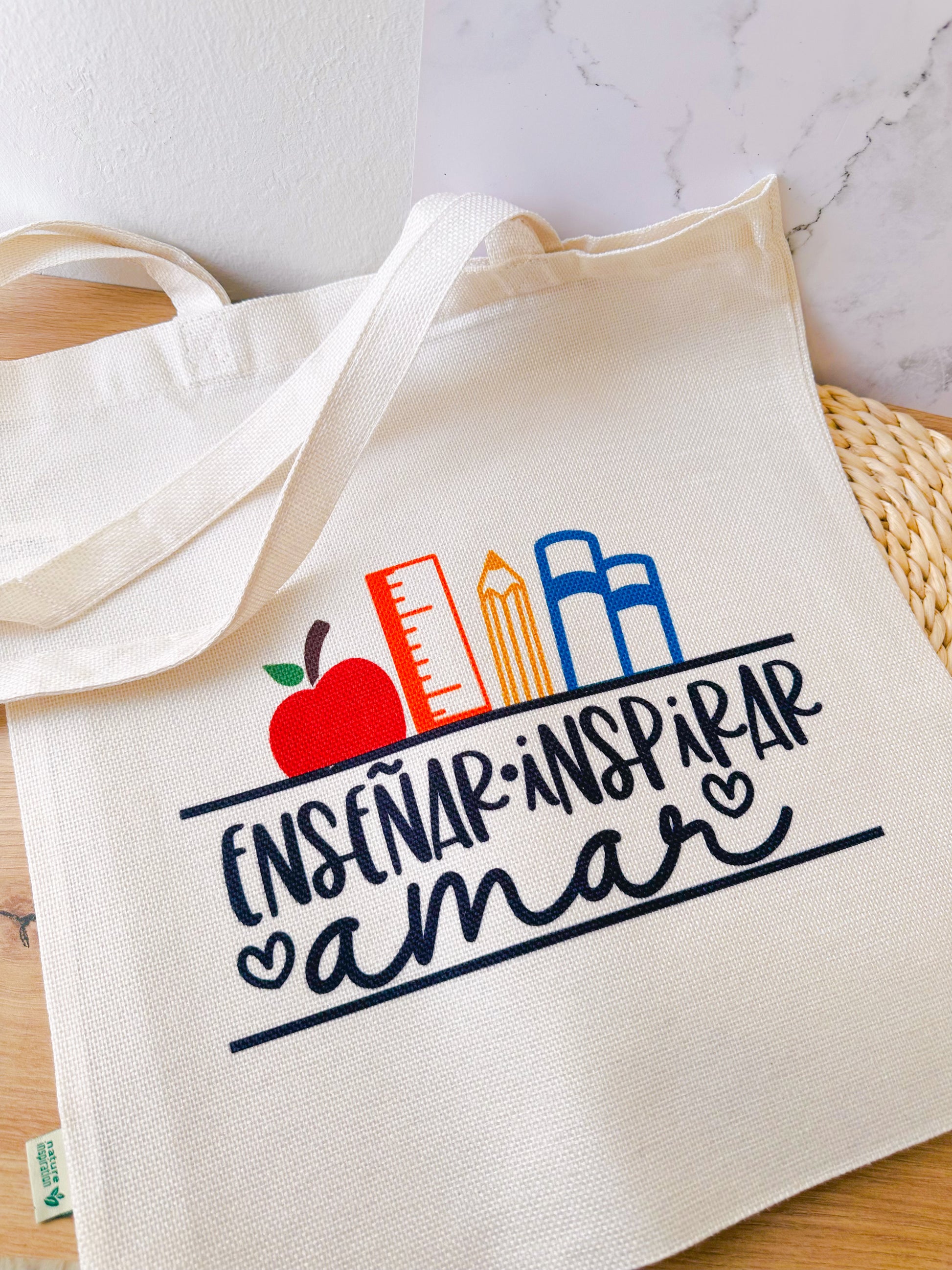 Práctica, resistente y con el diseño educativo más bonito: Enseñar, Inspirar, Amar. Perfecta para llevar cuadernos, estuche, material… ¡y mucho cariño!