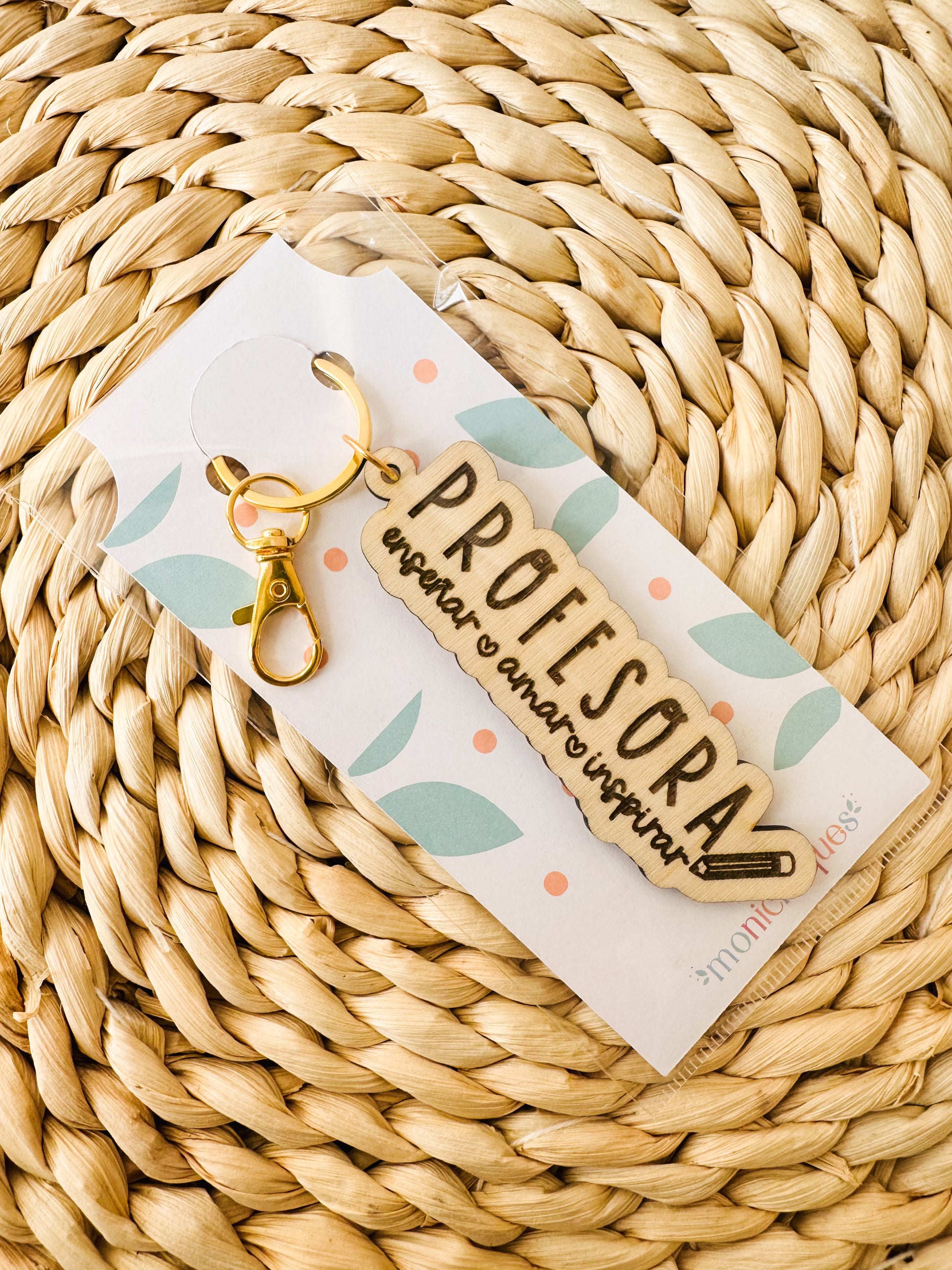 Grabado con la palabra Profesora y la frase enseñar, amar, inspirar. Un detalle elegante que llevará siempre con ella.